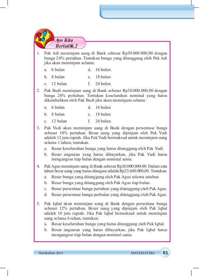 Soal Dan Jawaban Ayo Kita Berlatih 6 2 Aritmatika Sosial Kelas 7 M4thguru from 1.bp.blogspot.com Jika koperasi memberikan suku bunga 12 artinya pak rahmat harus mengembalikan total sebesar rp 525.000,00 yang akan dicicil selama 5. Besar bunga uang yang dipinjam oleh pak yudi selama 9 bulan adalah rp 72.000 tentukan jumlah uang yang dipinjam oleh pak yudi dari bank tersebut. Besar uang yang dipinjam oleh pak yudi adalah 12 juta rupiah. Begitu juga dengan bunga tabungan atau pinjaman di bank, mereka akan menetapkan bunga bunganya akan memiliki perbandingan yang sama apabila ingin meminjam uang 5 juta atau 10 rumus: Seringkali kita mendengar seseorang mengangsur rumah, atau meminjam uang di bank untuk. Dengan memperhatikan nominal bunga yang harus ditanggung jika meminjam modal di bank 1, bank 2, dan bank 3 tersebut tentu kita akan memilih 5. Contoh lainnya adalah penggunaan bunga di bank atau cicilan sebuah barang maka biasanya mereka menggunakan persentase sendiri artinya adalah per seratus atau dibagi dengan 100. .bank dengan persentase bunga sebesar10% pertahun.