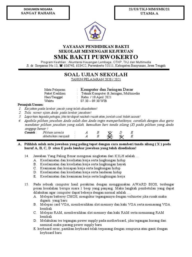 Soal Ujian Sekolah Tkj 2021 / Paket Uji Kompetensi Jurusan Teknik Komputer Dan Jaringan Tp 2020 2021 Smk Taruna Bhakti - Halo sahabat ahzaa, selamat datang kembali di ahzaanet.. Masih dengan seri latihan soal untuk ujian sekolah (us) kelas 9 yaa, pada post ini akan saya bagikan untuk soal mapel ips. Dapatkan penjelasan bukan hanya jawaban. Secara umum jaringan komputer terdiri dari di bawah ini kecuali. Soal terdiri atas 40 soal pg yang harus diisi seluruhnya. Soal ujian sekolah 2021 kerjaka soal dengan baik dan benar.